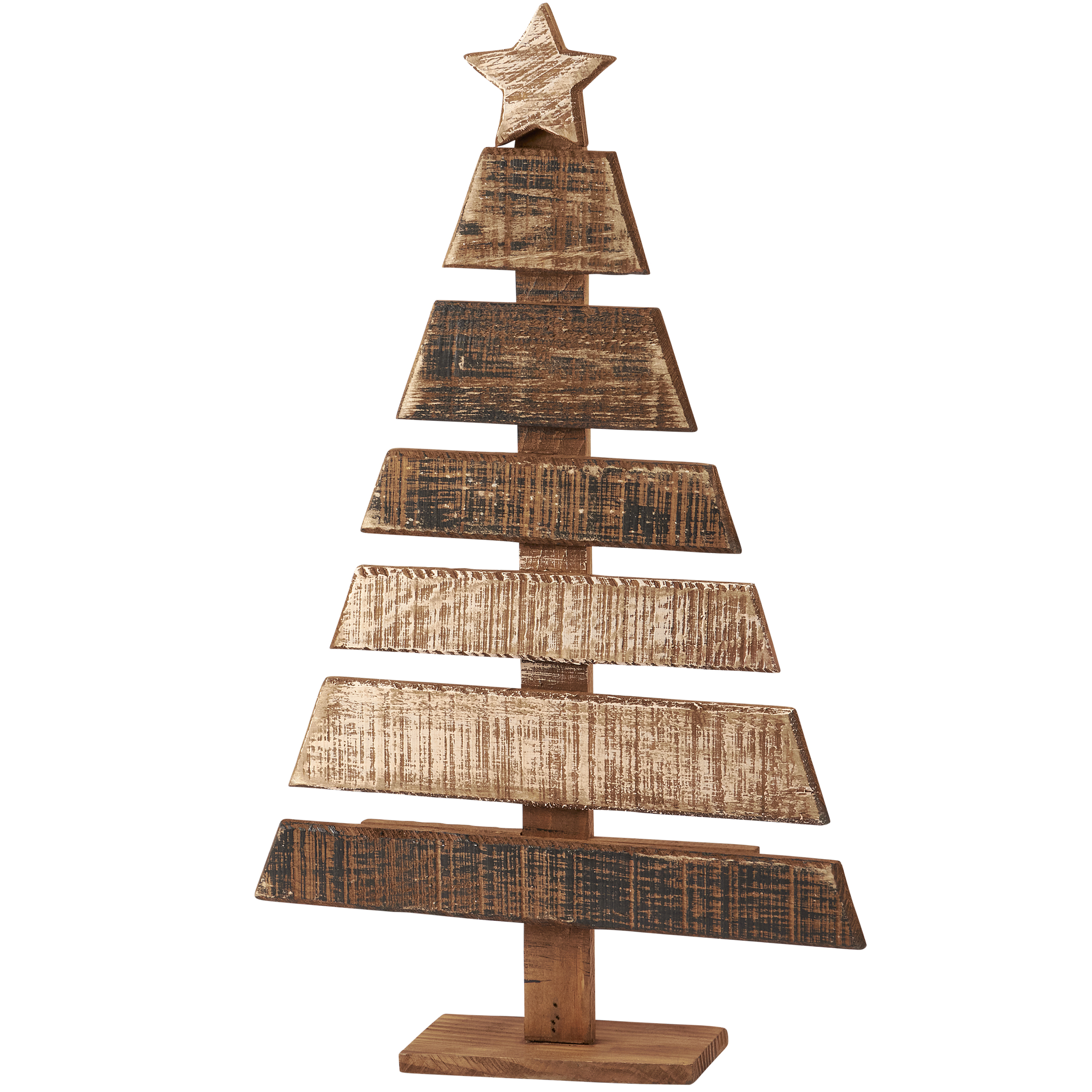 A decorative  tree displaying a rustic slat wood design. Christmas tree features slats of wood cut to form a tree shape with star on top. Each wood piece features distressed details and subtle painted accents. Our slat Christmas tree is designed to free-stand on flat surface for display. A rustic seasonal home accent perfect for the holidays.