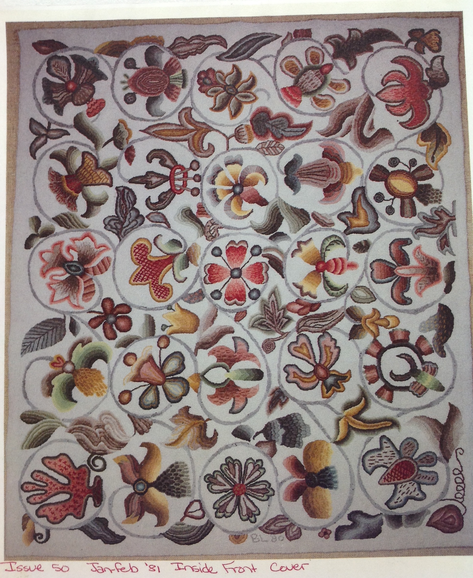 Please Note–the photos of these rugs are from the notebooks and archives of Joan Moshimer. This rug was hooked by Betty Larson. So lovely and intricate. It is featured in the Rug Hookers News and Views, 1981 Jan/Feb issue. This magazine has been a highlight for many rug hookers over the years. Joan Moshimer being the editor at the time of this issue.