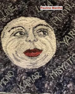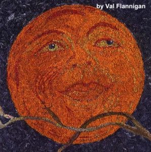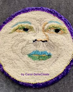 By the Light of the Moon, the Moon pattern is 15″ round. It was featured at Sauder Village Rug Show 2024. Teacher Lisanne Miller.