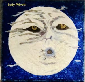 More by Carol DelleChiaie, and her “Mardis Gras Moon” has beading. Laura Strawn ultra punched her “Stages of the Moon”. Jane Smith sculpted little hearts in her “Love you to the Moon and Back”, and so did Vickie Robertson sculpting lips on her “Strawberry Moon”. Serena Wakelin and her “Harvest Moon” has a spooky witch and her moon is winking at her, and Judy Privett got into the Halloween spirit with her “Howling Moon”. Judy Shields hooked a “Peppermint Moon” and Jane Dunaway made hers a “Blue Kentucky Moon”. Babs Williams “Blue Moon” added fur and dimension in hers. And “Fly Me To The Moon” by Deb Kelley is after her favorite song. Pauline Mantha included “Moon” in all languages in her background. So much creativity!!!!