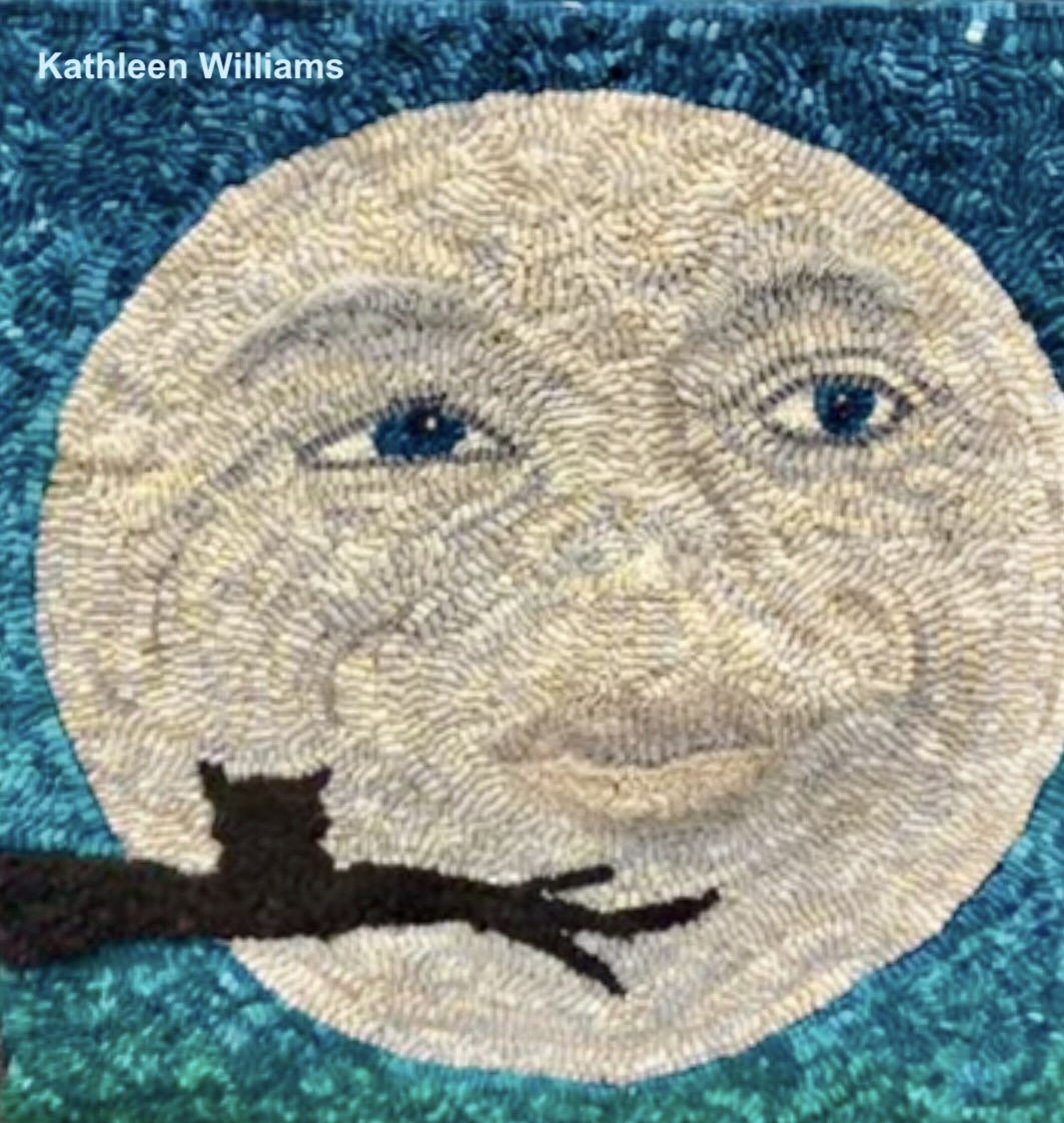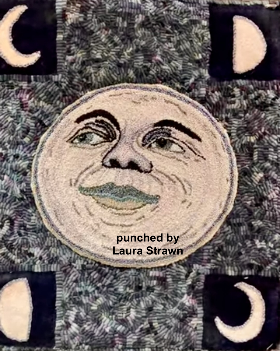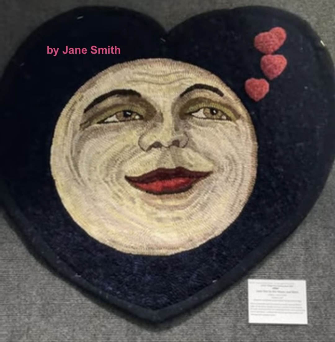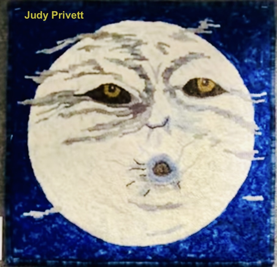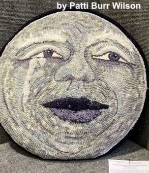 By the Light of the Moon, the Moon pattern is 15″ round. It was featured at Sauder Village Rug Show 2024. Teacher Lisanne Miller.