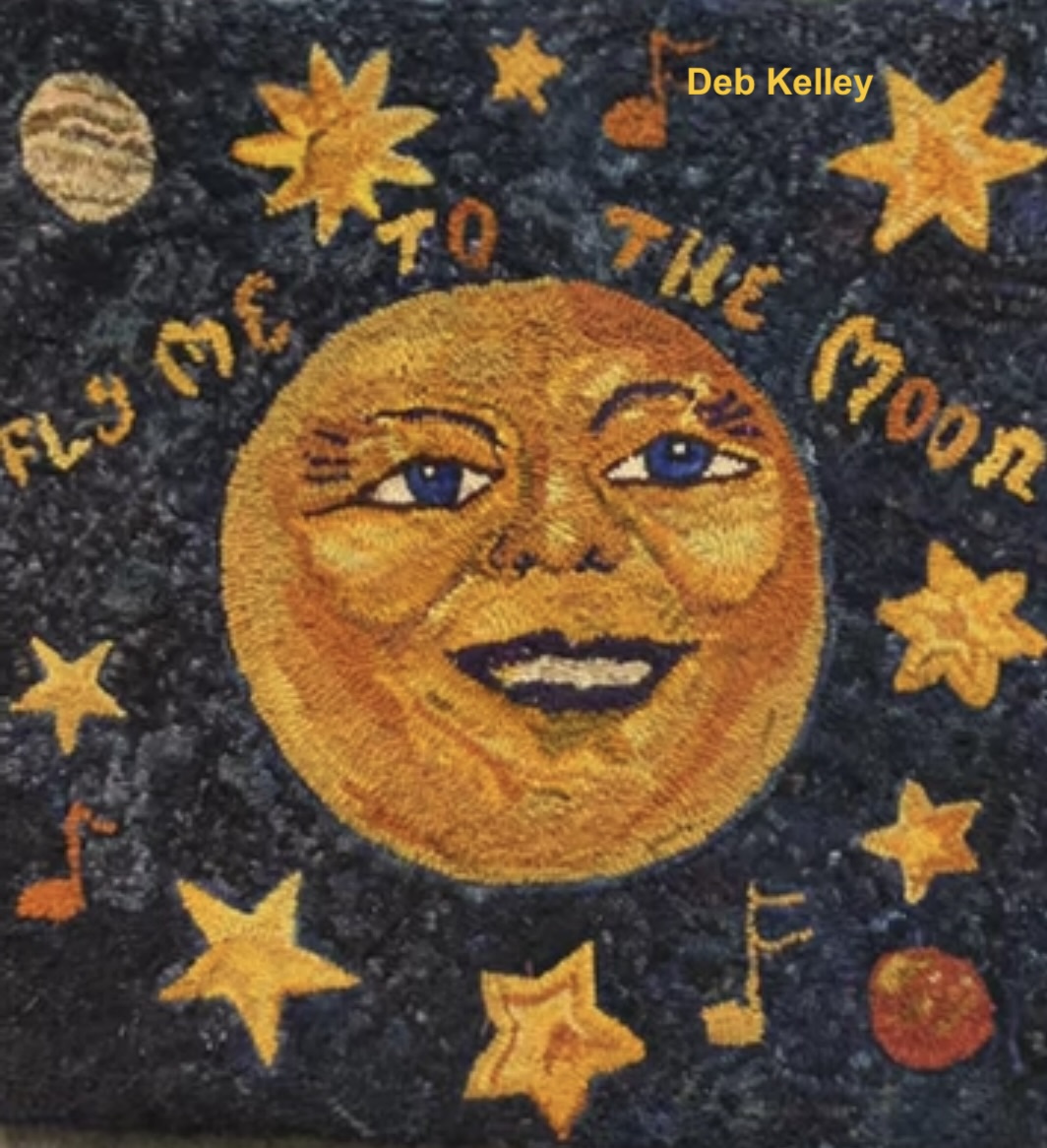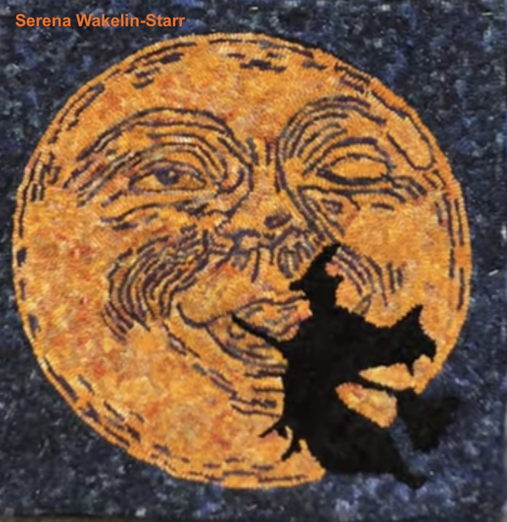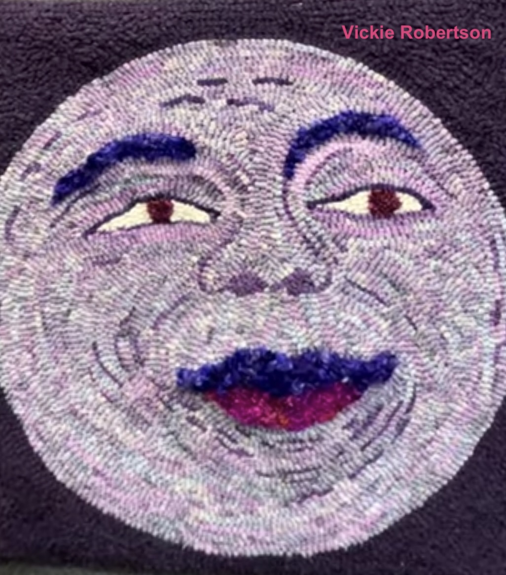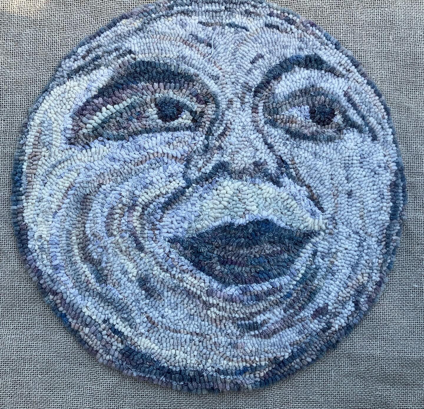 By the Light of the Moon, the Moon pattern is 15″ round. It was featured at Sauder Village Rug Show 2024. Teacher Lisanne Miller.