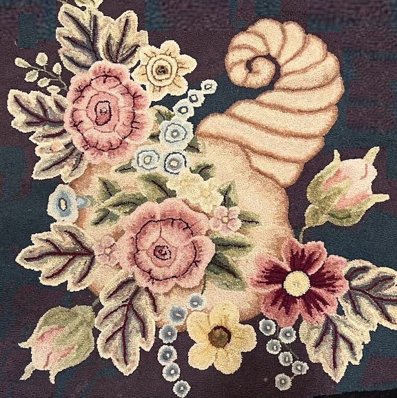Cornucopia of Spring, Pillow Size – by Joan Moshimer, 16″ x 16″. It is a beautiful floral with fun embellishments, such as Arctic Rays or Metallic Yarn for a 3D effect. Try our dip spots hand dyed wool for shading effects. We have a large variety of hand dyed wools for your rug such as Taupey Rose, Fruit & Floral, Jade and more!Mix Textured wool with Dyed wool for a complete look.Please click the link to view all our in-stock textures.https://dev.wcushing.com/product-category/textured-wool/