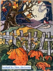 *Our example hooked by Pam Springer…she altered her pumpkin.  Another by Elaine Hirter