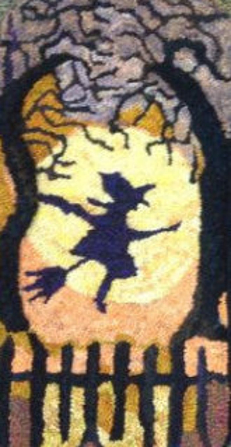 This rug is actually 3 individual pieces (a triptych) that form one larger piece. Each pattern–witch, house and cat are 10 x 18 Pictured is the pattern for this listing and second photo is what all three look like together.