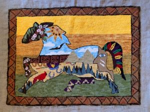 American Horse 28 x 39 SD 623. Pattern by Salma Dhanji. *Embellishments such as Arctic Rays, Fur, Roving, Burly Spun or Metallic Yarn for a 3D effect to add to your pattern! Perfect way to be creative! Some beautiful dyed colors to use are Amethyst, Hunters Moon, Yellow Topaz, Best of Blue from our dyed wool. Mix Textured wool with Dyed wool for a complete look. Please click the link to view all our in-stock textures. https://dev.wcushing.com/product-category/textured-wool/