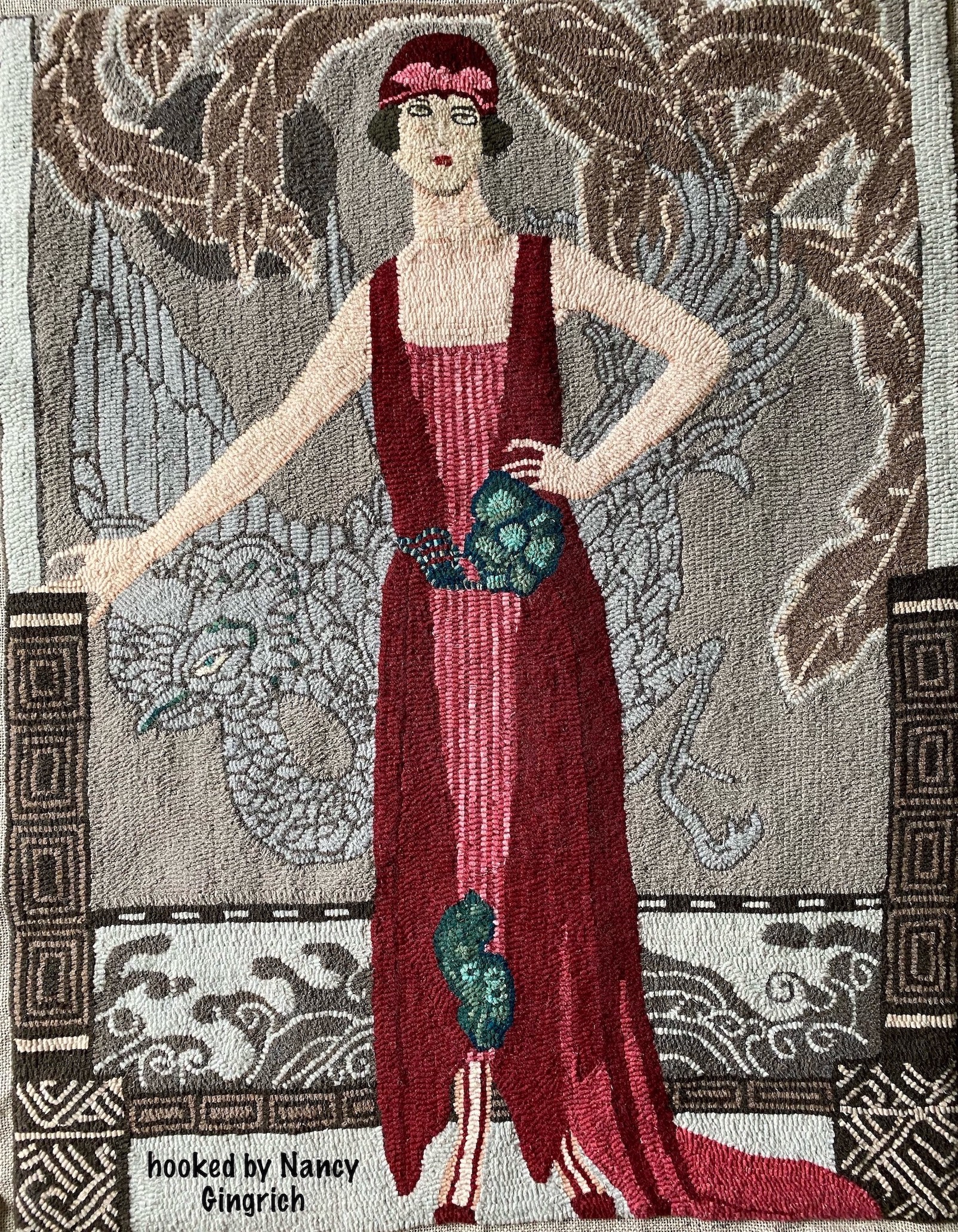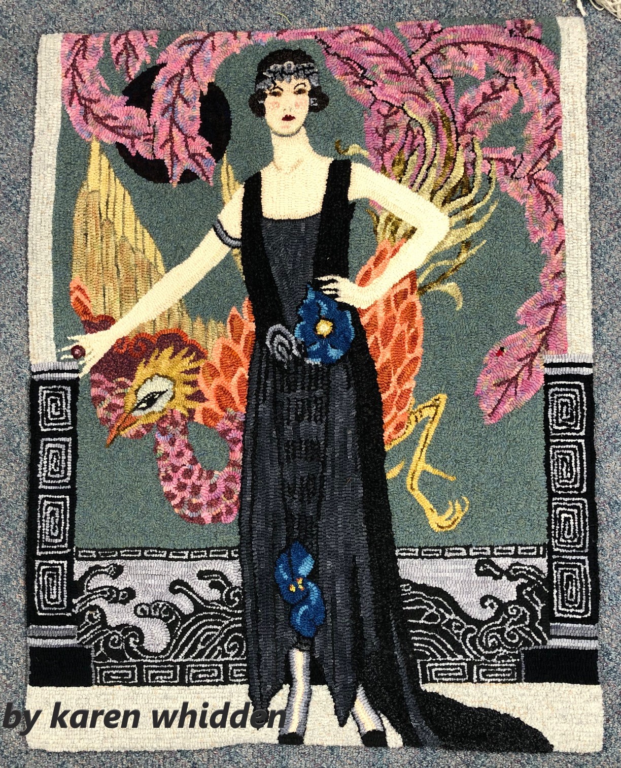 Art Deco Delight, fun pattern, brilliant colors, 25 x 37. Based on a Vintage Postcard. Our first example photo is by fiber artist Karen Whidden. And second by Nancy Gingrich. Gorgeous detail! *Embellishments such as Arctic Rays, Fur, Roving, Burly Spun or Metallic Yarn for a 3D effect to add to your pattern!