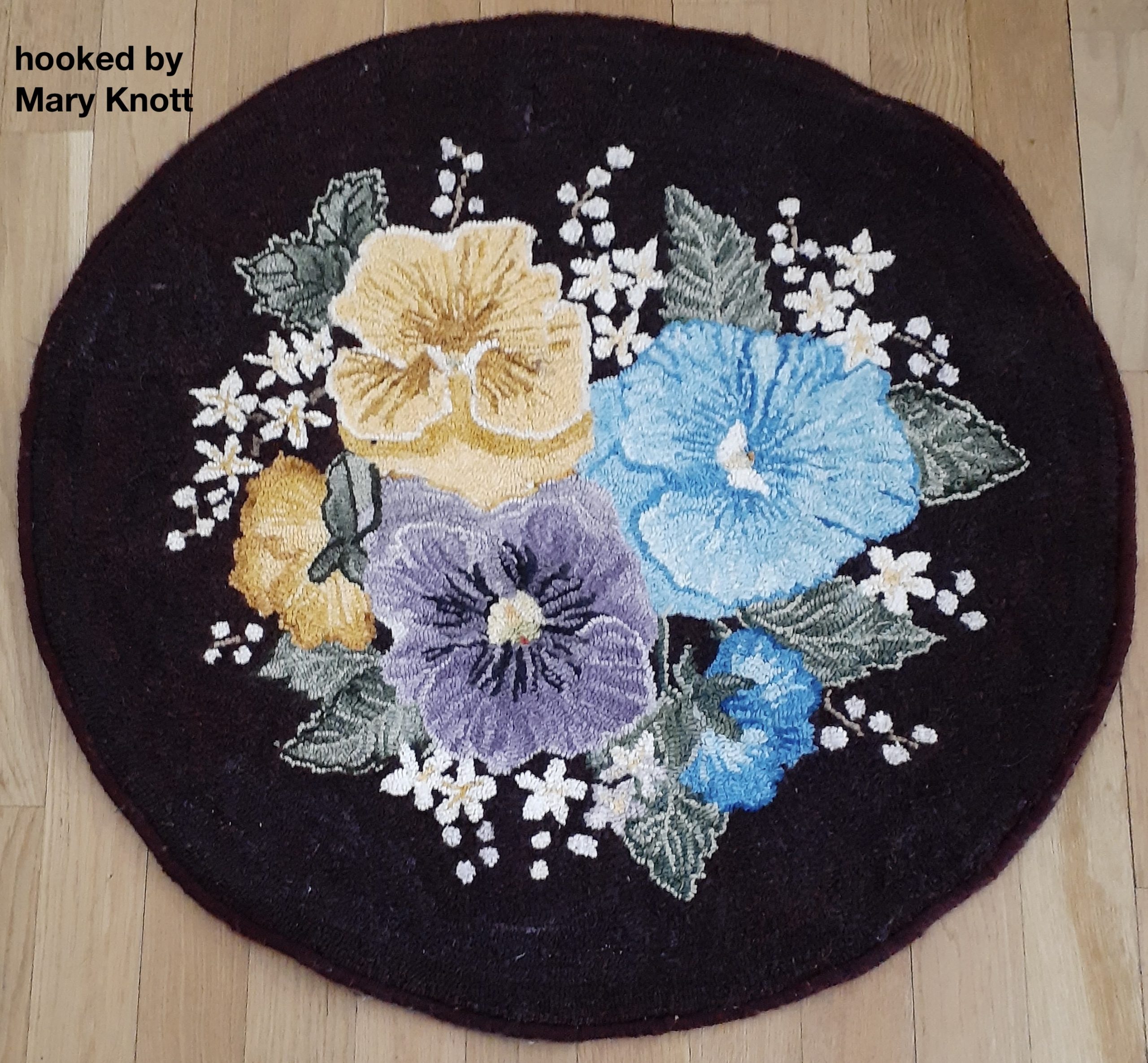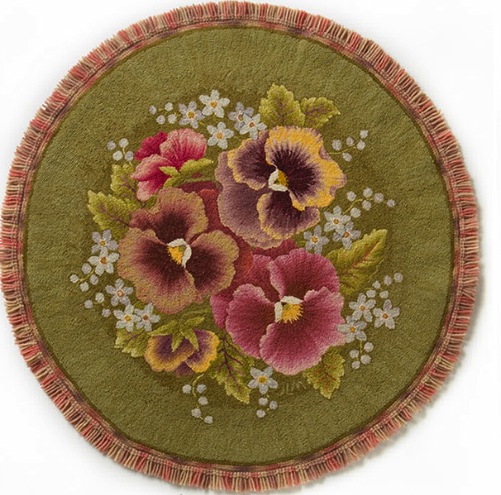 Aurora Pansies 36″ Round M425 Joan Moshimer Pattern.  A beautiful round floral rug!  Fun to use velvet, metallics, burly spun yarns and your stash!  Viola, Twinkle, Vintage Gold, Fields of Green, Cupid’s Blush and Raspberry Burst are complimentary dyed wool.  Mix Textured wool with Dyed wool for a complete look.  Please click the link to view all our in-stock textures.  https://dev.wcushing.com/product-category/textured-wool/