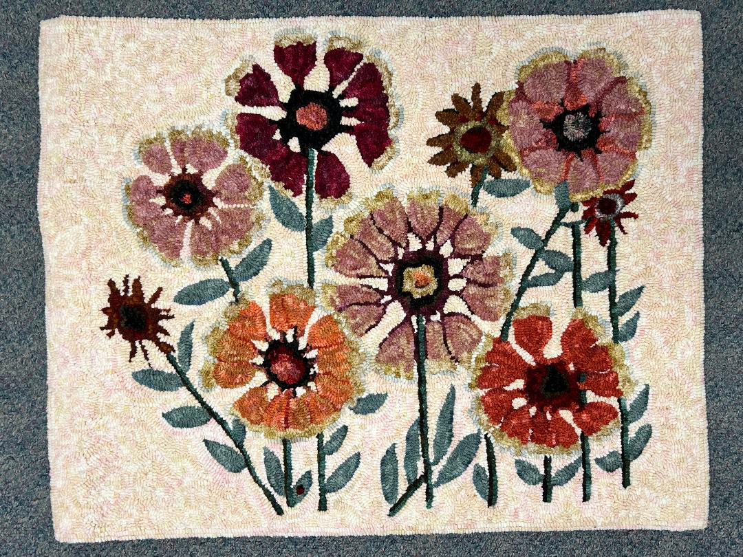 Blanket Flowers, a completed rug hooked by Karen Whidden,
