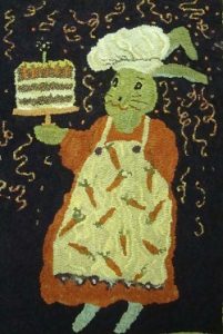 Carrot Cake, 24″ x 35″ This delightful chef is proud of her carrot cake. It could be for any celebraton. The confetti is done with one wool.
