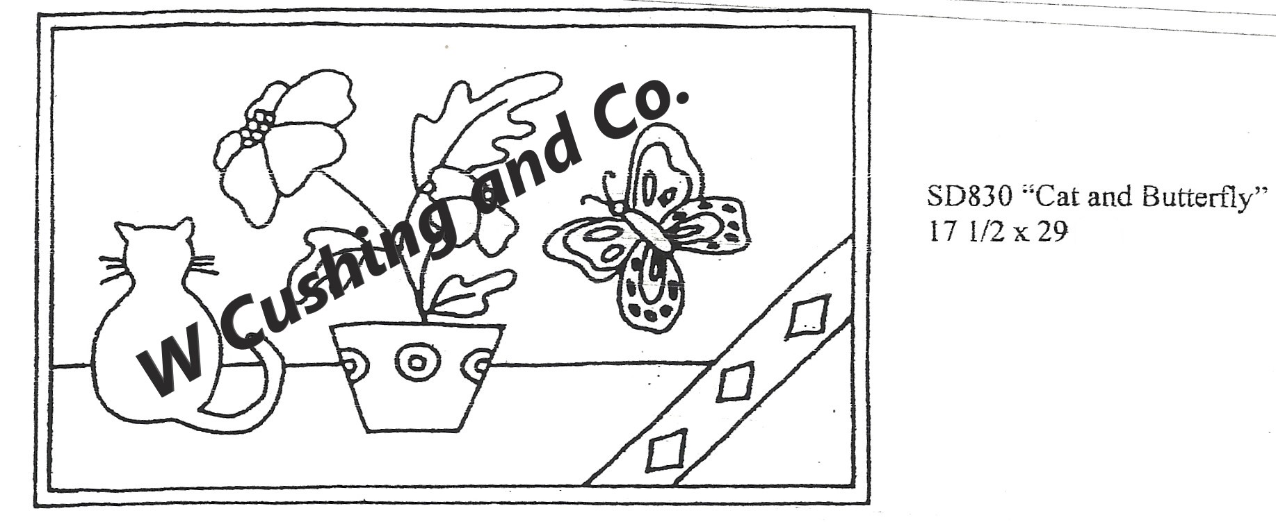Cat and Butterfly Pattern by Salma Dhanji SD830 17.5 x 29 inches.   A great pattern to get creative with.  *Embellishments such as Arctic Rays, Fur, Roving, Burly Spun or Metallic Yarn for a 3D effect to add to your pattern!  Perfect way to be creative!  Wonderful dyed wools to use are any of our Vintage Color series, Biddeford Pool, Amethyst and more!  Mix Textured wool with Dyed wool for a complete look.  Please click the link to view all our in-stock textures.  https://dev.wcushing.com/product-category/textured-wool/