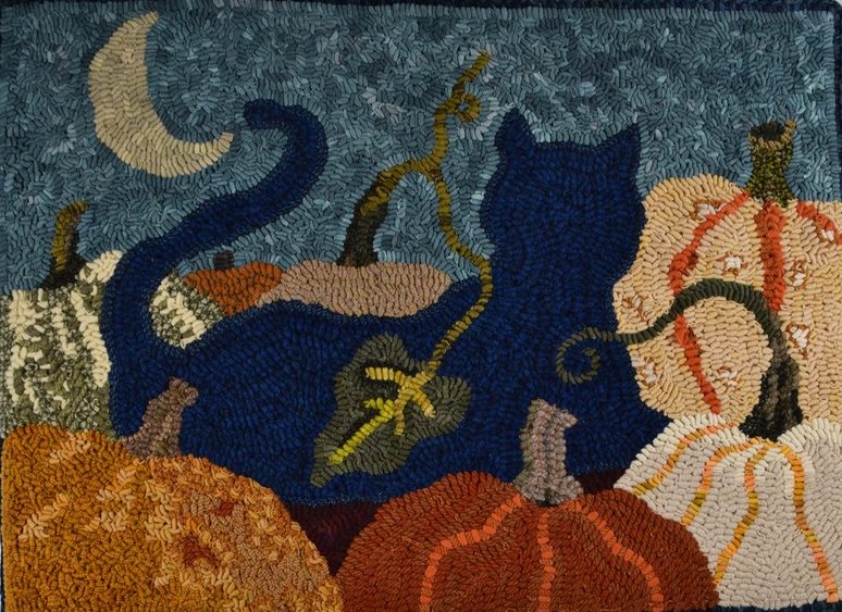 W. Cushing is proud to have Nola Hooks and Cactus Needle patterns! Cat in the Pumpkin Patch, Pattern by Cactus Needle, 20″ x 28″. *Embellishments are fun to add, such as Arctic Rays or Metallic Yarn for a 3D effect. Try our dip spots hand dyed wool for shading effects. We have a large variety of hand dyed wools for your rug such as Twinkle, Jacob’s Peach, Fall Pumpkin Patch, Vintage Label Pumpkin and more! Mix Textured wool with Dyed wool for a complete look. Please click the link to view all our in-stock textures. https://dev.wcushing.com/product-category/textured-wool/