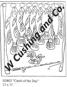 Catch of the Day Pattern by Salma Dhanji SD803 33 x 33 inches. A wonderful primitive pattern. A great rug to use all your favorite colors. *Embellishments such as Arctic Rays, Fur, Roving, Burly Spun or Metallic Yarn for a 3D effect to add to your pattern! Perfect way to be creative!