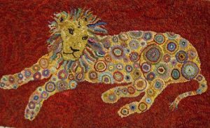 Cat’s Paw, 24″ x 35″     Inspired by cats paw style.  Most of the circles were hooked in 6-cuts while the background is done in 8-cuts.