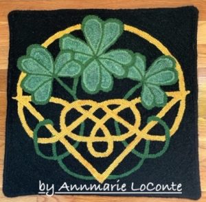 The newest pattern in our Celtic Heritage Seriesis full of Luck—Celtic Basket of Shamrocks Rug Hooking Pattern, 18 x 18. The color ways are endless! You can combine wool and one of our velvets, use two velvets, make it Christmas, Fall or Winter! Each pattern will be printed WITHOUT an outside border on an 18 x 18 piece of linen so you can make it a pillow, table mat or candle mat. Embellishments are fun to add, such as Arctic Rays or Metallic Yarn for a 3D effect.