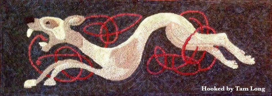 P is for Primitive is thrilled to be the exclusive designer and distributor of the Celtic patterns offered in this first “Heritage Series.” While inspired by the Book of Kells and the Nordic Book of Kells, each is an original by Lisanne. 44″ x 15″ Celtic Dog pattern is on linen with edges serged. Try fur, velvets or boucle yarn as mixed media in your rug.
