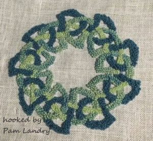The newest pattern in our Celtic Heritage Series–Celtic Locking Wreath, 18 x 18. The color ways are endless! You can combine wool and one of our velvets, use two velvets, make it Christmas, Fall or Winter! Embellishments are fun to add, such as Arctic Rays or Metallic Yarn for a 3D effect. Each pattern will be printed WITHOUT an outside border on an 18 x 18 piece of linen so you can make it a pillow, table mat or candle mat