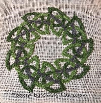 The newest pattern in our Celtic Heritage Series–Celtic Locking Wreath, 18 x 18. The color ways are endless! You can combine wool and one of our velvets, use two velvets, make it Christmas, Fall or Winter! Embellishments are fun to add, such as Arctic Rays or Metallic Yarn for a 3D effect. Each pattern will be printed WITHOUT an outside border on an 18 x 18 piece of linen so you can make it a pillow, table mat or candle mat