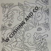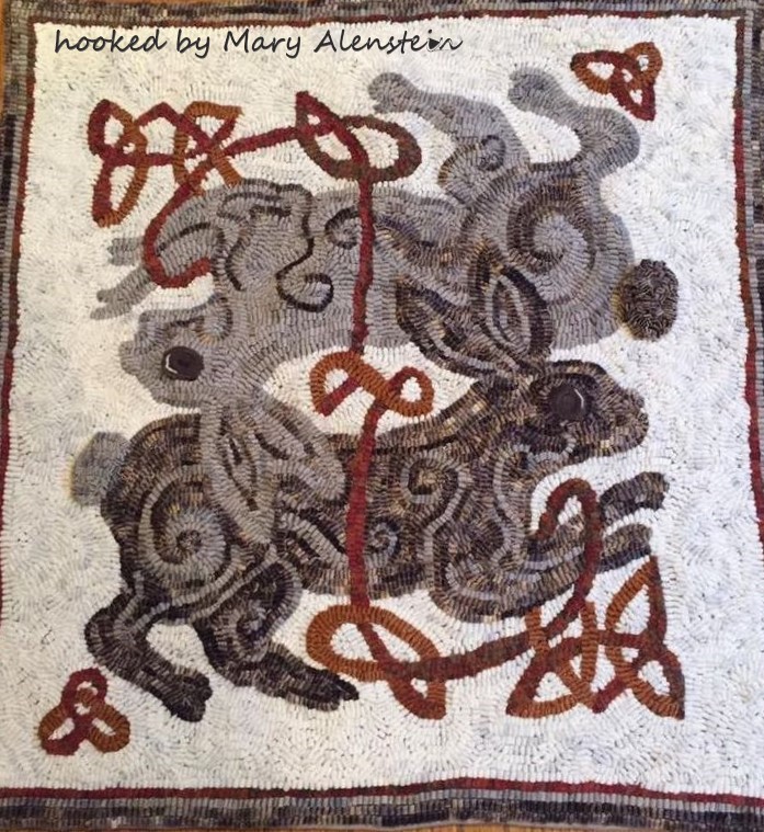 P is for Primitive is thrilled to be the exclusive designer and distributor of the Celtic patterns offered in this first “Heritage Series.” While inspired by the Book of Kells and the Nordic Book of Kells, each is an original by Lisanne. 24″ x 24″ Celtic Rabbits pattern is on linen with edges serged. Try fur, velvets or boucle yarn as mixed media in your rug.