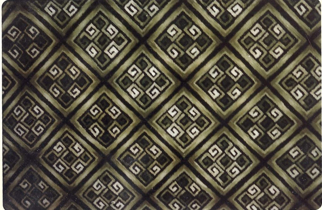 This beautiful geometric rug is Chou (large) by Pearl McGown OSV 738 36″ x 60″. Also available in another size…see our website. Fun to use velvet, metallics, burly spun yarns and your stash!