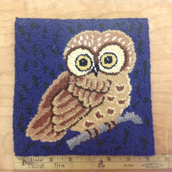 Cute Owl Tile approx. 7″ square, MT8 from Moshimer’s Studio on our finest linen, just the pattern. Great to hook and use in an easel, as a candle mat or the center of your Fall Wreath! Use your leftover noodles and hook in neutrals, black and orange and more! Try fur, velvets or boucle yarn as mixed media in your rug.