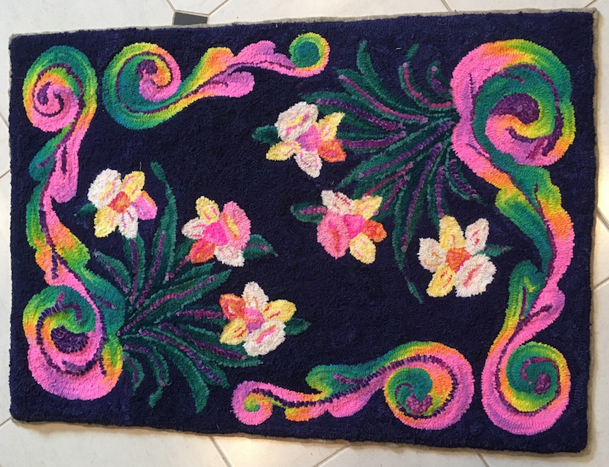 Daffodils M128, 25 x 36 inches Joan Moshimer Pattern. So many colors you can use! Our Dyed wool will surely help make it pop! Check out Dawn, Gardens for Storybook, Flower Power, Yellow Topaz or Blossom from our dyed wool. Embellishments are fun to add, such as Arctic Rays or Metallic Yarn for a 3D effect.