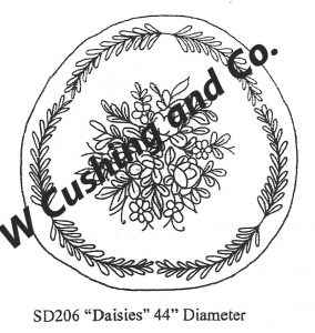 Daisies Pattern by Salma Dhanji, 44″ Diameter SD206. A good pattern for bright colors and creativity. Fun to use velvet, metallics, burly spun yarns and your stash! Suggested dyed wools are Cupids Blush, Emerald, Mother of Pearl, Ye Old Parchment and more! Mix Textured wool with Dyed wool for a complete look. Please click the link to view all our in-stock textures. https://dev.wcushing.com/product-category/textured-wool/