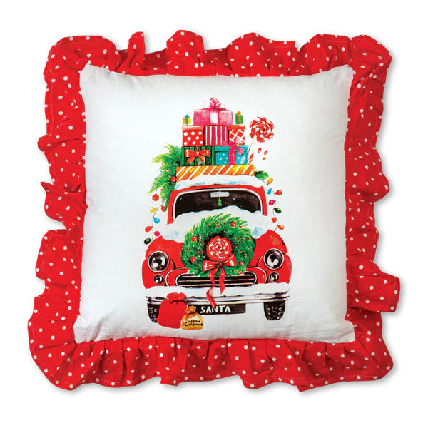 Throw Pillow with Holiday Red Truck! This throw pillow is 100% cotton with a poly fill and zipper closure.