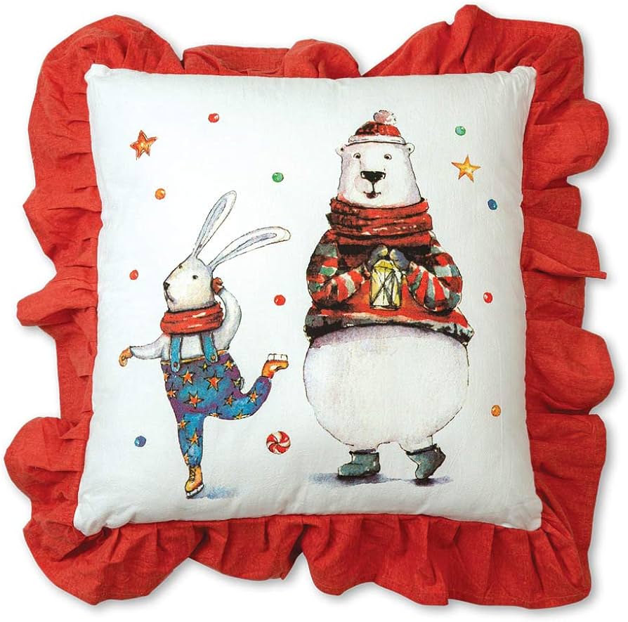 Throw Pillow with Bunny and Polar Bear This throw pillow is 100% cotton with a poly fill and zipper closure.