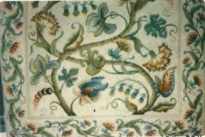 Duke of Devonshire, OSV 711 by Pearl McGown 48″ x 86″, is a fabulous crewel rug pattern, great to use our dip spots for the leaves.  Embellishments are fun to add, such as Arctic Rays or Metallic Yarn for a 3D effect.  Try our dip spots hand dyed wool for shading effects.  We have a large variety of hand dyed wools for your rug such as  Blue Topaz, Raspberry Burst, Sassy Sunflower, Grassy Knoll and more!  Mix Textured wool with Dyed wool for a complete look.  Please click the link to view all our in-stock textures.  https://dev.wcushing.com/product-category/textured-wool/