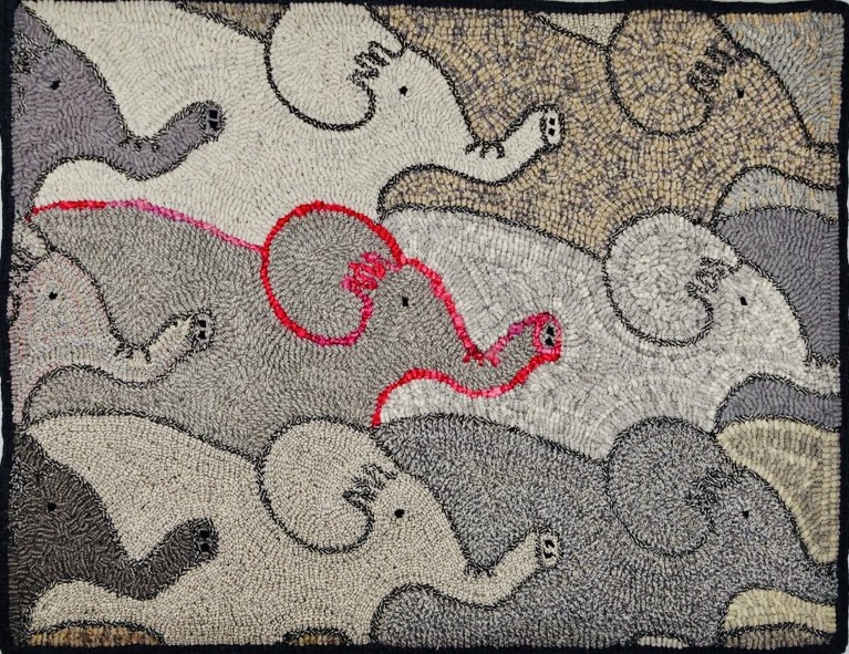 W. Cushing is proud to have Nola Hooks and Cactus Needle patterns! Elephant Parade, Pattern by Cactus Needle, 31 1/2” x 24 1/2”. *Embellishments are fun to add, such as Fur, Arctic Rays or Metallic Yarn for a 3D effect. Try our dip spots hand dyed wool for shading effects. We have a large variety of hand dyed wools for your rug such as Jacob’s Wine, Gull, Biddeford Pool, Misty and more! Mix Textured wool with Dyed wool for a complete look. Please click the link to view all our in-stock textures. https://dev.wcushing.com/product-category/textured-wool/