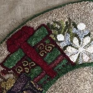 Pattern is 24″ round. We offer hand dyed wools such as Fireworks, Christmas Red, Imari jade, Snow, Imari Gold and more. Try some of our yarns to bind with. We have mixed media, furs and sequin threads to add! Mix Textured wool with Dyed wool for a complete look. Please click the link to view all our in-stock textures. https://dev.wcushing.com/product-category/textured-wool/