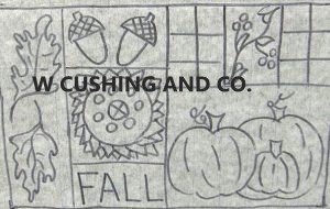 14″ x 10″ Fall Sampler pattern by P is for Primitive. This pattern is on linen with edges serged. Embellishments are fun to add, such as Arctic Rays or Metallic Yarn for a 3D effect.