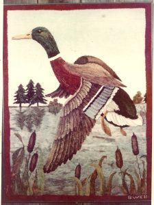 Flight of the Mallard Duck P133, Pearl McGown pattern, 22″ x 29″ . Beautiful in any color scheme. A great primitive pattern to get creative with. Fun to use velvet, metallics, burly spun yarns and your stash!
