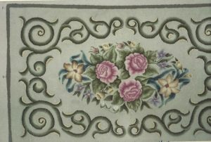 Frost Swirl by Pearl McGown OSV 322 27″ x 44″. It is a beautiful floral that embellishments are fun to add, such as Arctic Rays or Metallic Yarn for a 3D effect. Try our dip spots hand dyed wool for shading effects. We have a large variety of hand dyed wools for your rug such as Raspberry Burst, Jacob’s Peach, Yellow Topaz, Imari Jade and more!
