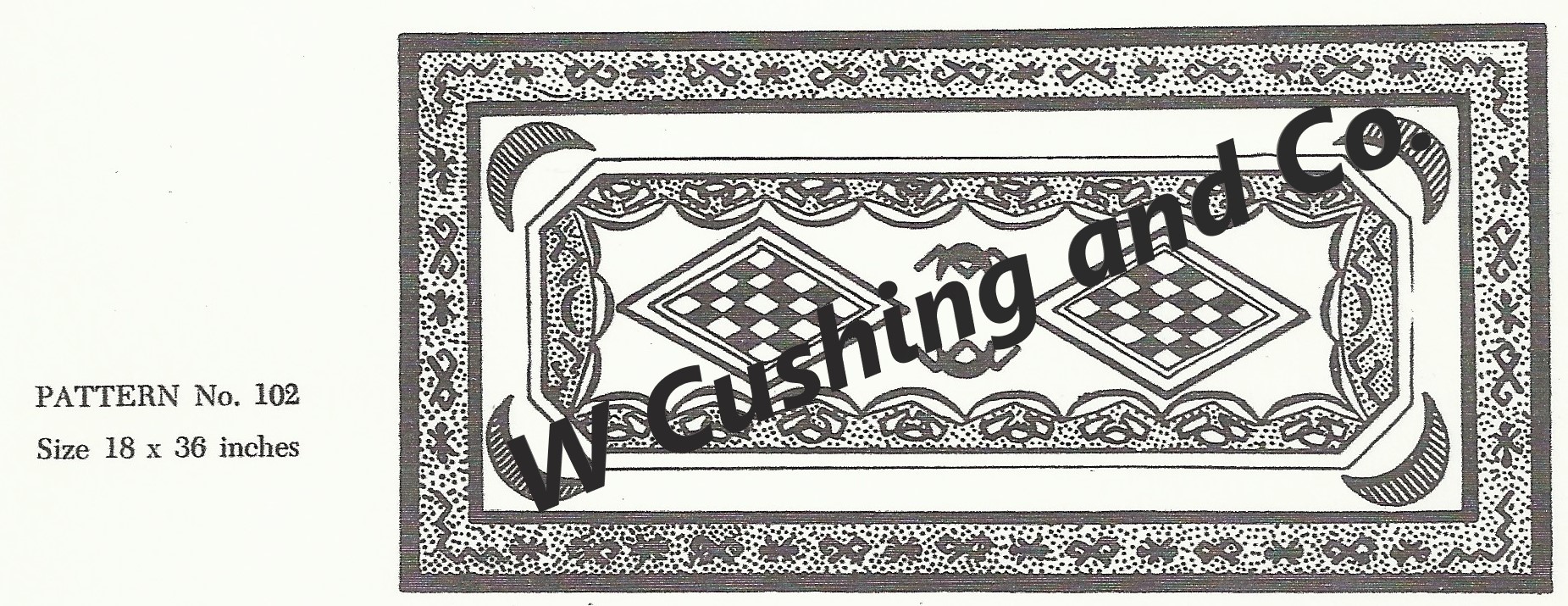 Frost’s Pattern No. 102, 18″ x 36″, GV 102. Can be very creative pattern with use of colors from our texture wools and hand crafted dyed wools. Fun to use velvet, metallics, burly spun yarns and your stash!
