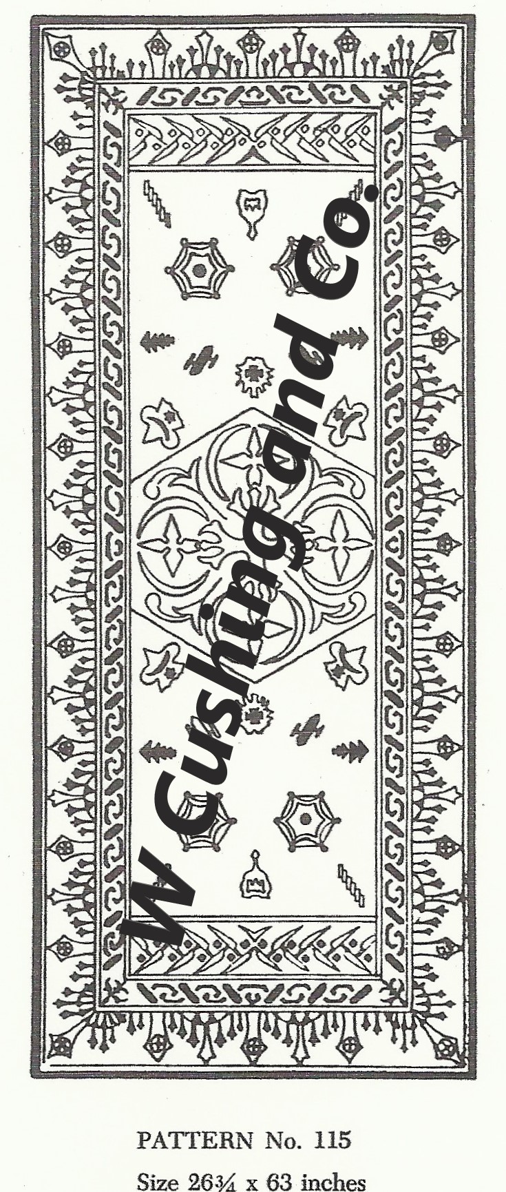 Frost’s Pattern No. 115, 26 1/4″ x 63″, GV 115. A good oriental rug to get creative with. Embellishments are fun to add, such as Arctic Rays or Metallic Yarn for a 3D effect. Suggested Dyed Wools: Imari Gold, Green Oh Green, Raspberry Burst, Jack Frost and more! Mix Textured wool with Dyed wool for a complete look. Please click the link to view all our in-stock textures. https://dev.wcushing.com/product-category/textured-wool/