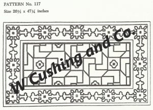 Frost’s Pattern No. 117, 26 1/2″ x 47 1/4″, GV 117. A great oriental pattern! Can be very creative pattern with use of colors from our texture wools and hand crafted dyed wools. Fun to use velvet, metallics, burly spun yarns and your stash!