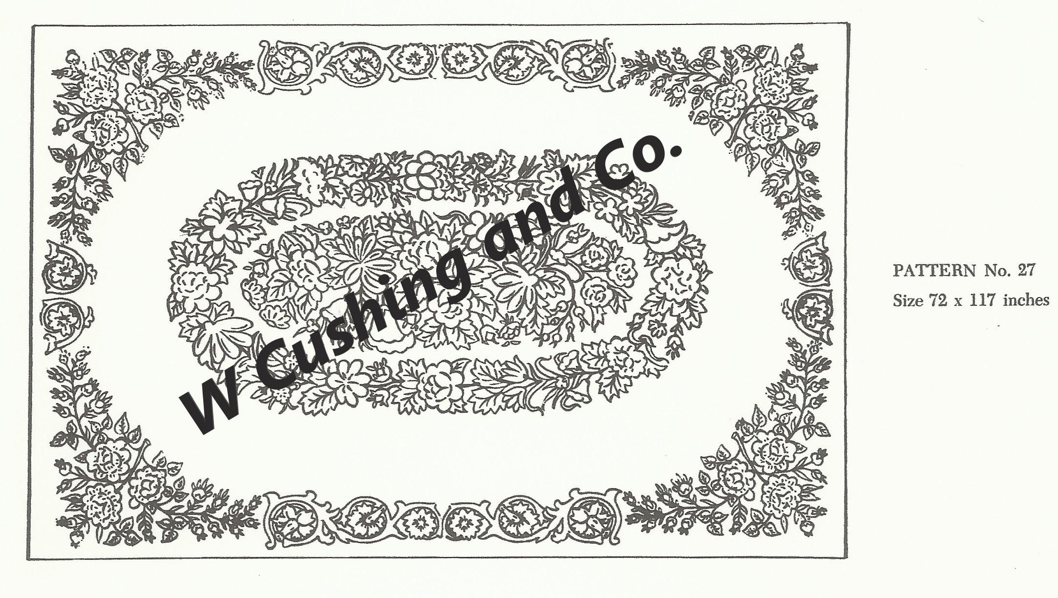 Frost’s Pattern No. 27, 72″ x 117″, GV 27. A true classic floral from late 1800’s- early 1900’s time period. Can be very creative pattern with use of colors from our texture wools and hand crafted dyed wools. Fun to use velvet, metallics, burly spun yarns and your stash!