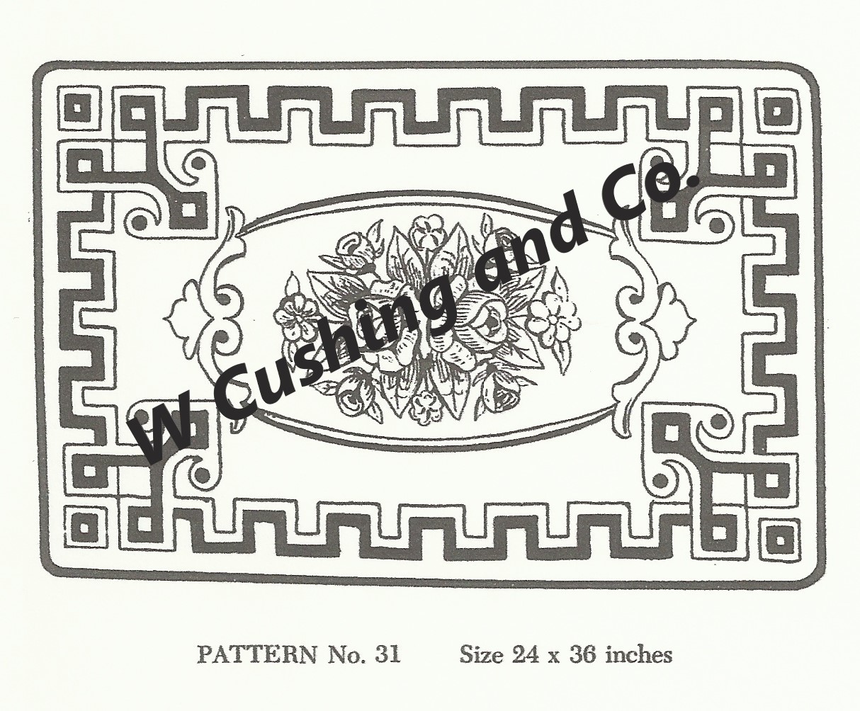 Frost’s Pattern No. 31, 24″ x 36″, GV 31. Can be very creative pattern with use of colors from our texture wools and hand crafted dyed wools. Fun to use velvet, metallics, burly spun yarns and your stash!