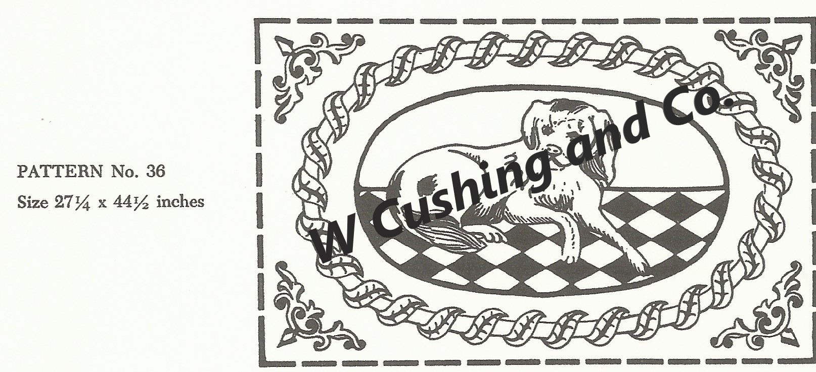 Frost’s Pattern No. 36, 27 1/4″ x 44 1/2″, GV 36. Such a great primitive pattern! Try fur, velvets or boucle yarn as mixed media in your rug. We have a large variety of colors for your scrolls, such as Winter Grays and Garnet. Try Imari Colors or Shades of Sepia from our hand dyed wool for your dog as well. Mix Textured wool with Dyed wool for a complete look. Please click the link to view all our in-stock textures. https://dev.wcushing.com/product-category/textured-wool/