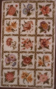 This wonderful geometric rug is Garden’s Gift (sm) by Pearl McGown OSV 575A 28″ x 44″ This pattern is available in another size–see separate listing. It is a beautiful floral that embellishments are fun to add, such as Arctic Rays or Metallic Yarn for a 3D effect. Try our dip spots hand dyed wool for shading effects. We have a large variety of hand dyed wools for your rug such as Jacob’sGreen Blue, Better Than Roses, Jacob’s Peach and Wine, Zinnia Garden and more!