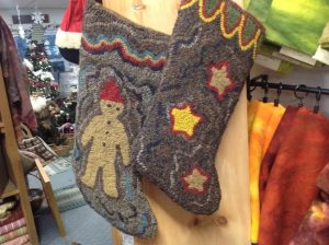 Gingerbread Stocking from Joan Moshimer’s Studio, 17 x 9 on our finest linen, just the pattern. Great Dyed Wools to use. . ..Mother of Pearl, Christmas Red, Imari Jade, or Christmas Green. Try embellishments such as Arctic Rays Wispy Fringe, Fur or Burly Spun Yarn in your pattern. We have many options. Mix Textured wool with Dyed wool for a complete look. Please click the link to view all our in-stock textures. https://dev.wcushing.com/product-category/textured-wool/