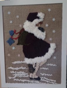 Girl in the Plum Coat, 24 x 18, a wonderful pattern inspired by the vintage postcard shown. Part of a Set of 3–Girl in the Cape and Girl with the Red Leggings. Try our mixed media such as fur yarn or boucle yarn with this pattern.