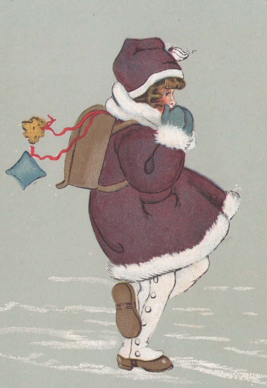 Girl in the Plum Coat, 24 x 18, a wonderful pattern inspired by the vintage postcard shown. Part of a Set of 3–Girl in the Cape and Girl with the Red Leggings. Try our mixed media such as fur yarn or boucle yarn with this pattern.