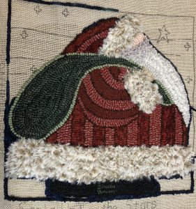 **We have other colors available…to see how it hooks, the following picture was hooked by Karen Preston and she used the Holly Green to outline the bag and Jolly Holiday Red for his stripes***pattern is Under the Stars and if you would like to view it, please click the link below: