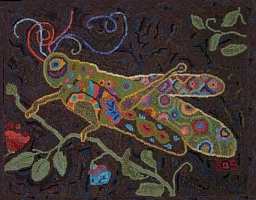 Grasshopper, 24″ x 35″ The artist spent some winter months in a village outside Guadalajara and was inspired by the abundance of comfortably warm insects. This hopper was born and reflects its colorful surroundings. Embellishments are fun to add, such as Arctic Rays or Metallic Yarn for a 3D effect.