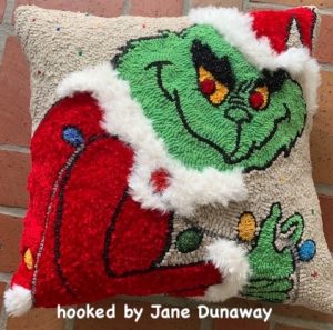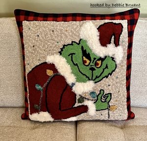 18″ x 18″ Grinch Pillow pattern by P is for Primitive. This pattern is on linen with edges serged. *Embellishments such as Arctic Rays, Fur, Roving, Burly Spun or Metallic Yarn for a 3D effect to add to your pattern! Perfect way to be creative! Use our velvets–red or maroon, silver, moss and raspberry metallic yarn. Our white fur or creamy burly spun yarn is a must!