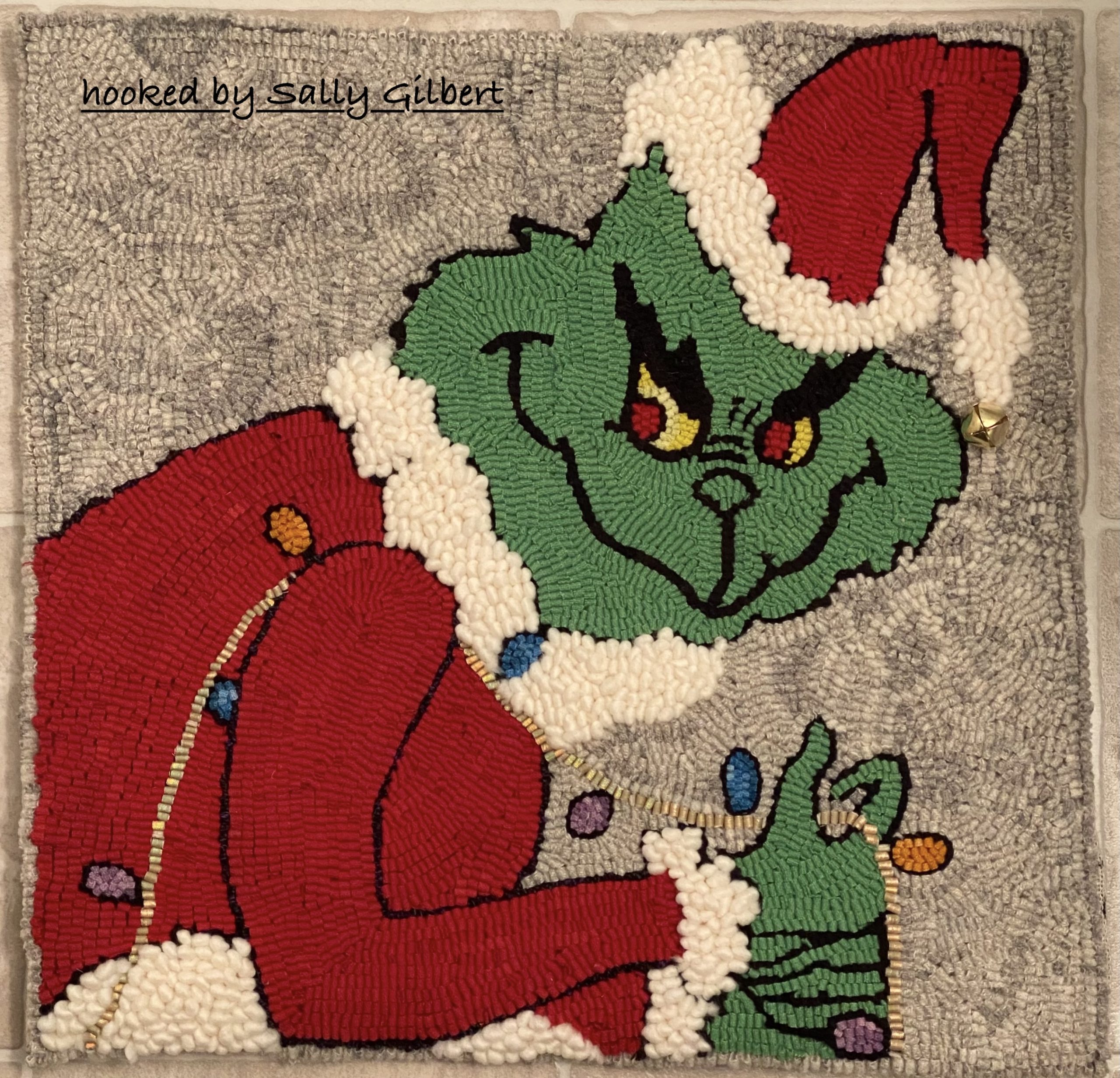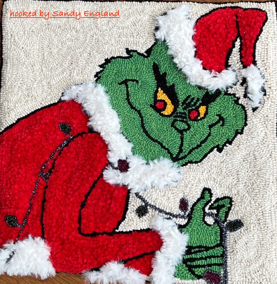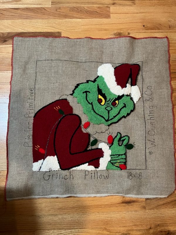18″ x 18″ Grinch Pillow pattern by P is for Primitive. This pattern is on linen with edges serged. *Embellishments such as Arctic Rays, Fur, Roving, Burly Spun or Metallic Yarn for a 3D effect to add to your pattern! Perfect way to be creative! Use our velvets–red or maroon, silver, moss and raspberry metallic yarn. Our white fur or creamy burly spun yarn is a must!