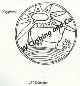 Happiness, pattern by Primitive Grace, 15 inch diameter. What a cute pattern for your chair seat. Try fur, velvets or boucle yarn as mixed media in your rug. Try Jacob’s Brown, Mother of Pearl, Gull, Granite and any of our beautiful Imari dyed wools. Mix Textured wool with Dyed wool for a complete look. Please click the link to view all our in-stock textures. https://dev.wcushing.com/product-category/textured-wool/